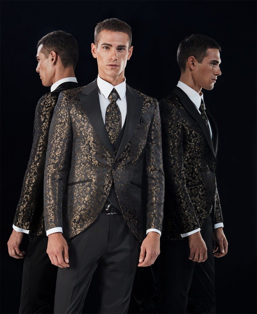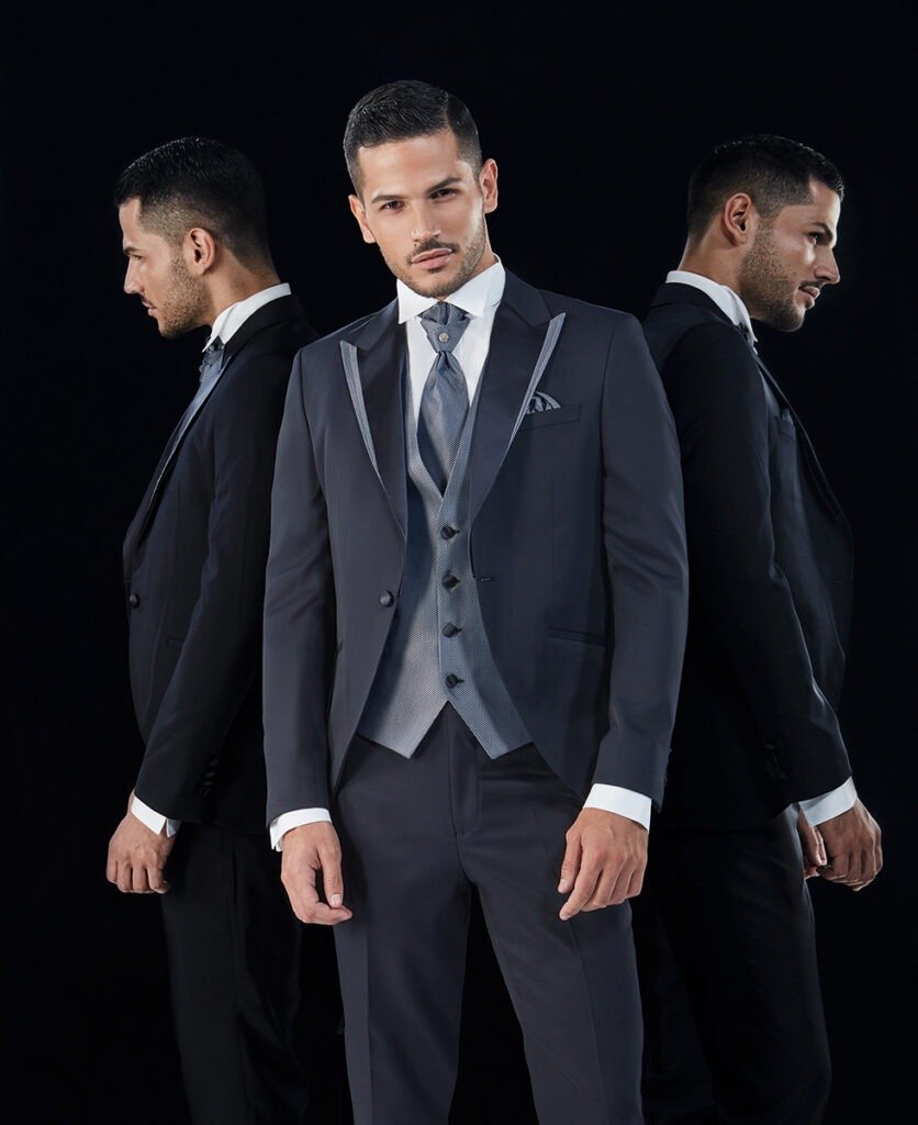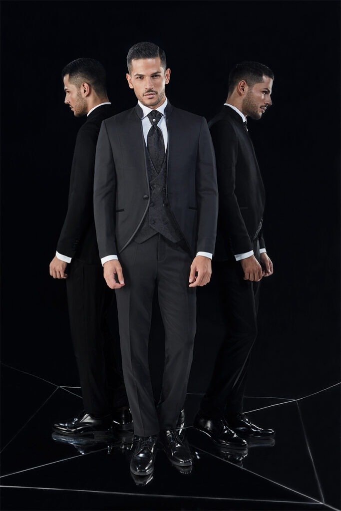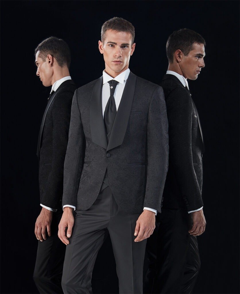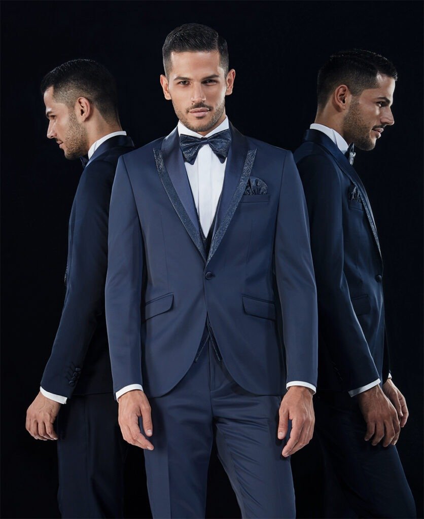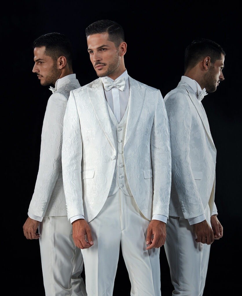 Le collezioni comprendono smoking, abiti da cerimonia e modelli di alta rappresentanza, ideali per matrimoni esclusivi e contesti raffinati.