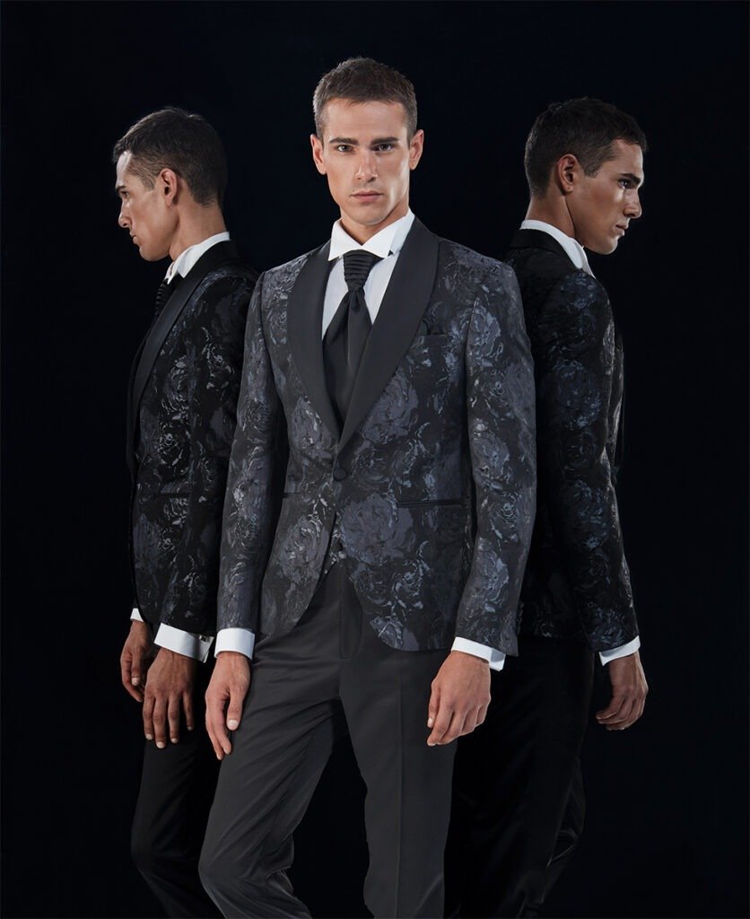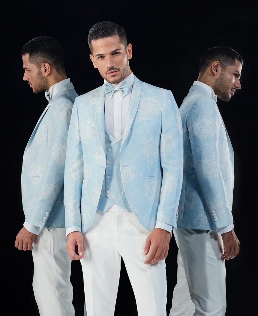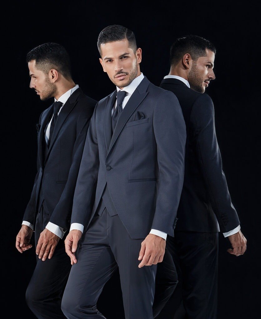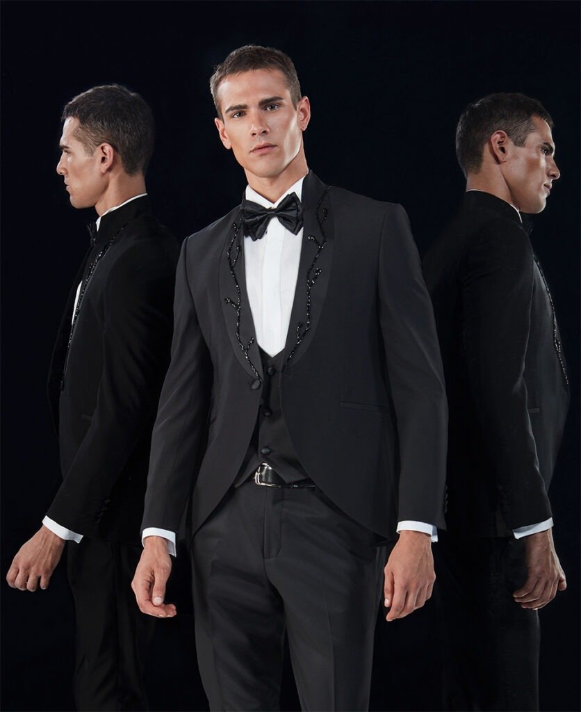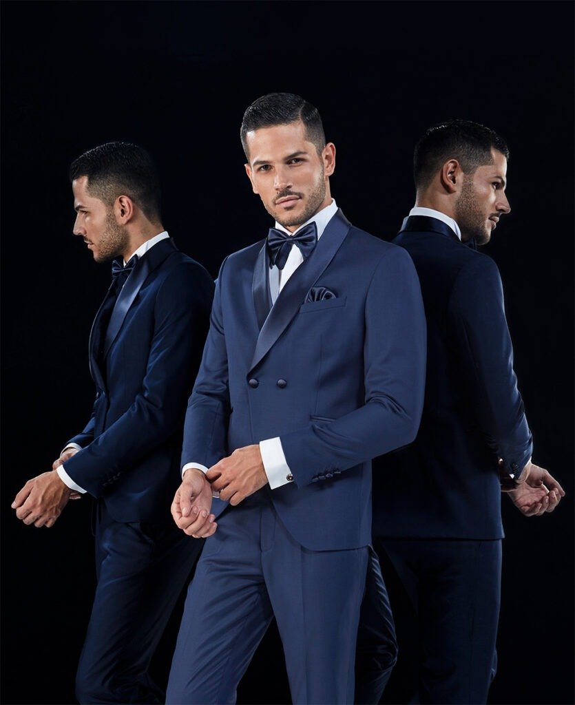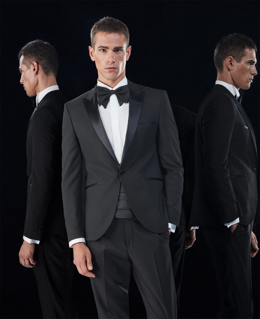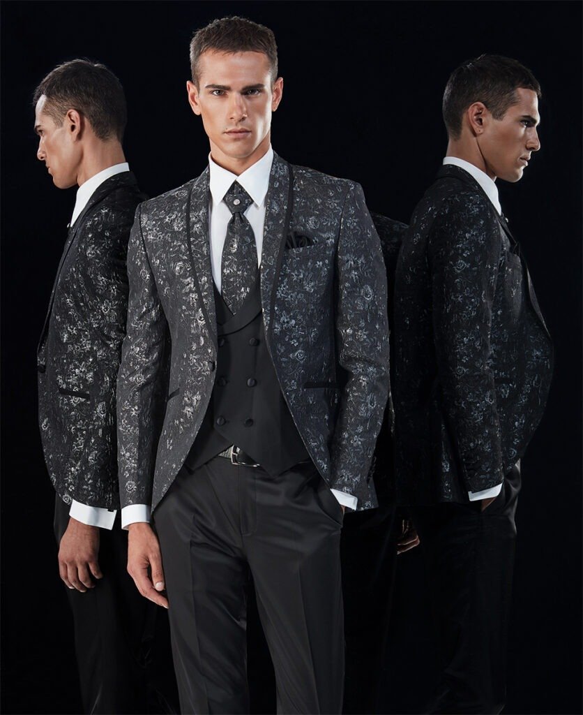 Le collezioni comprendono smoking, abiti da cerimonia e modelli di alta rappresentanza, ideali per matrimoni esclusivi e contesti raffinati.